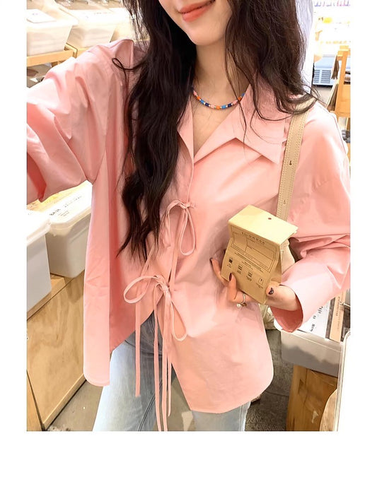 Fri. 通勤百搭萊賽絲翻領設計感蝴蝶結襯衫 粉