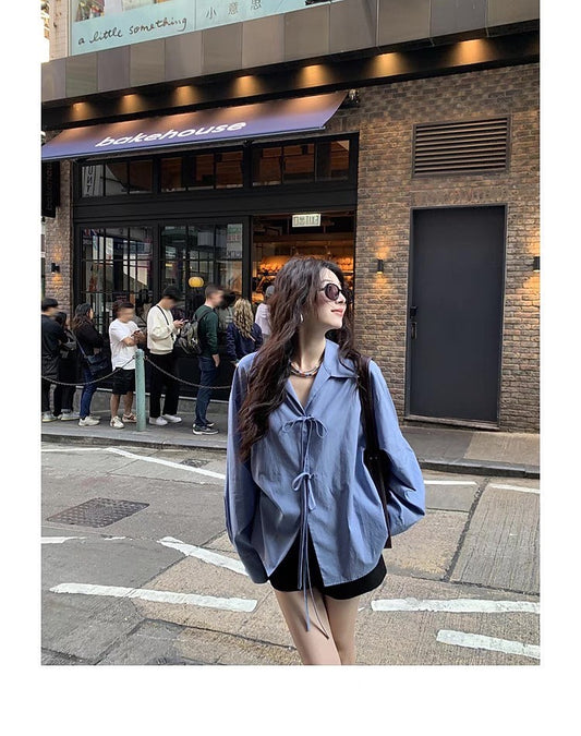 Fri. 通勤百搭萊賽絲翻領設計感蝴蝶結襯衫 藍