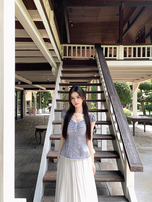 Wed.叛逆學姊 減齡學院修身領結藍色襯衫 顯瘦A字半身裙 灰