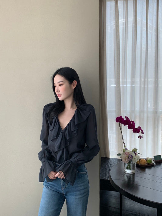Wed. 韓女氣質荷葉v領花袖襯衫 黑