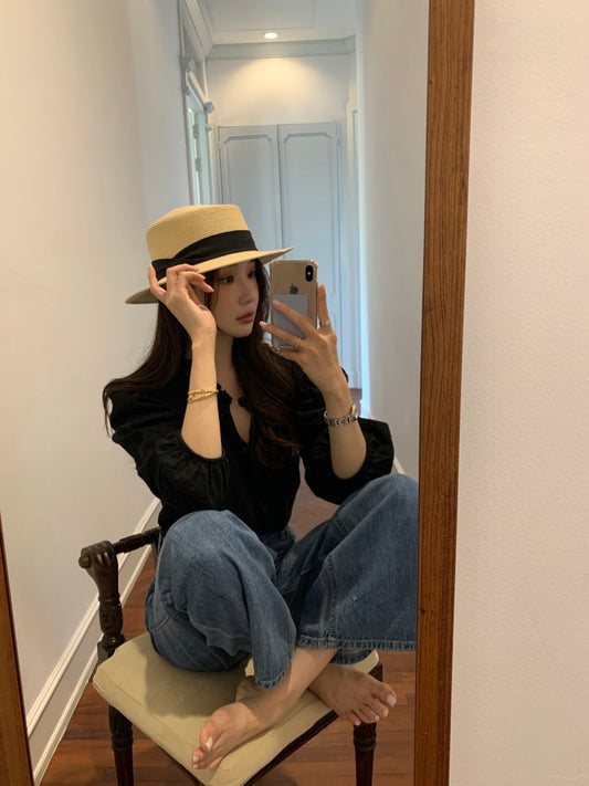 Wed. 鄉村田野 甜妹木耳邊氣質襯衫 黑