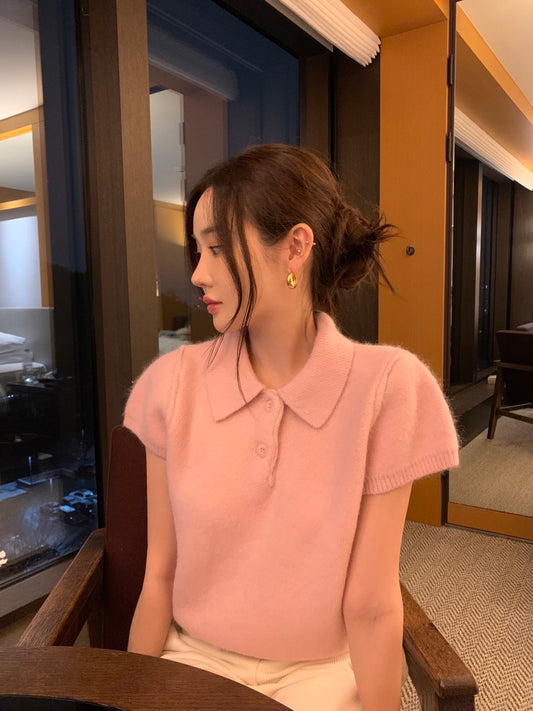 Tue. 個性單排扣polo領小短袖針織上衣 粉