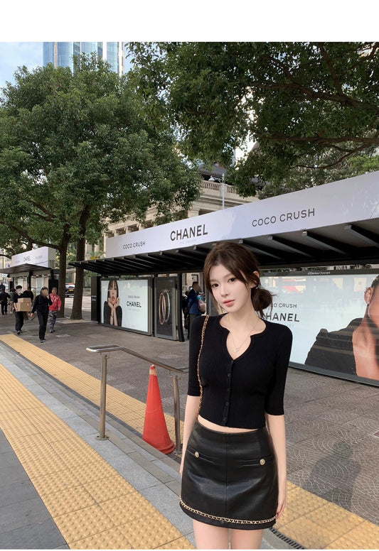 Wed.韓系天菜 氣質鈕扣可調緊身針織5分袖上衣 黑/白