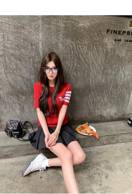 Wed.修狗多巴胺 TB學院麻花針織短袖上衣 紅/深藍
