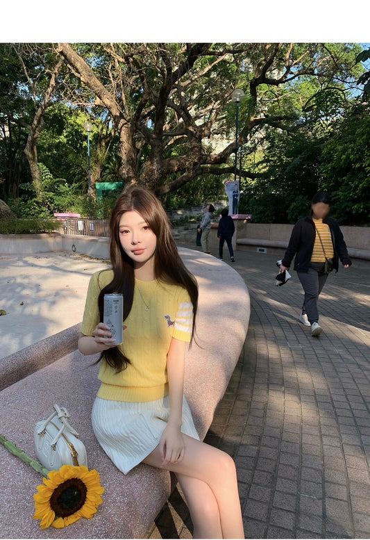 Wed.修狗多巴胺 TB學院麻花針織短袖上衣 鵝黃/淺灰