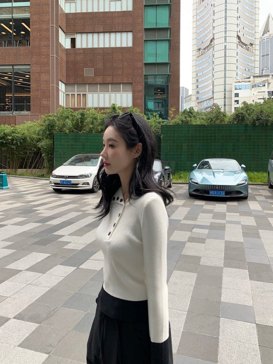 Fri. 氣質別緻 撞色翻領可調鈕扣針織上衣