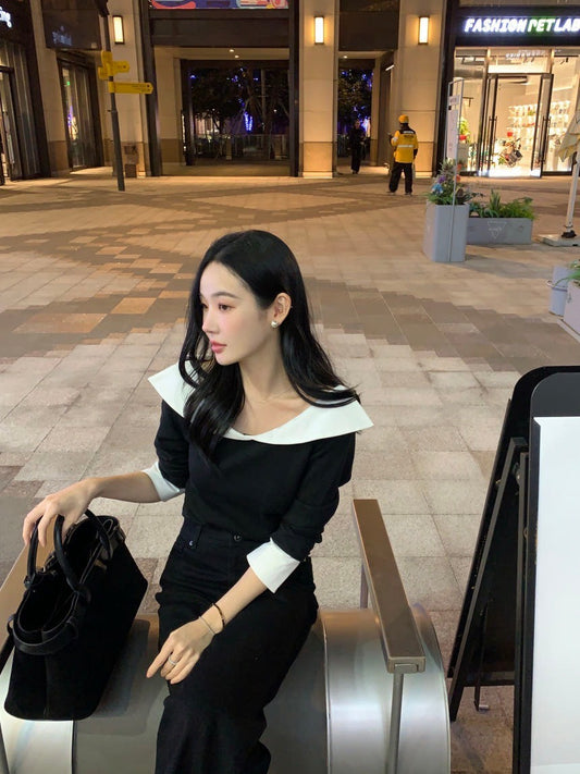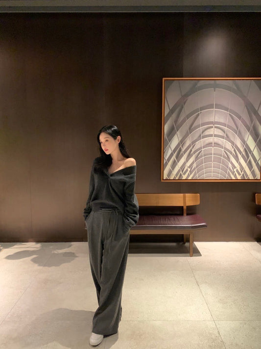 Fri. 韓chic氣質一字翻領針織上衣 休閒粗坑長褲 黑