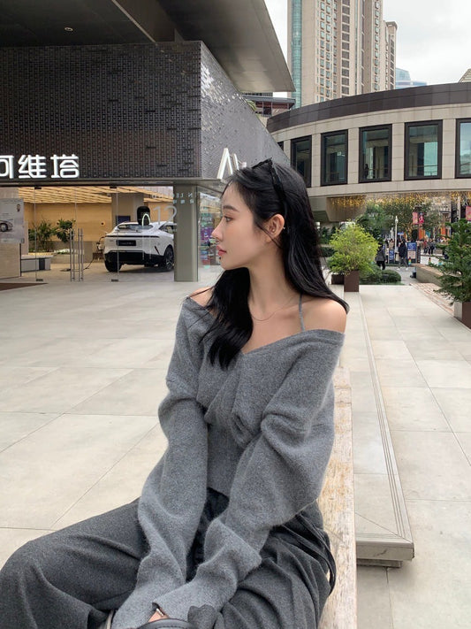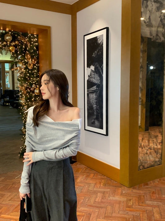 Fri. 通勤百搭 休閒V開領露肩針織上衣 灰