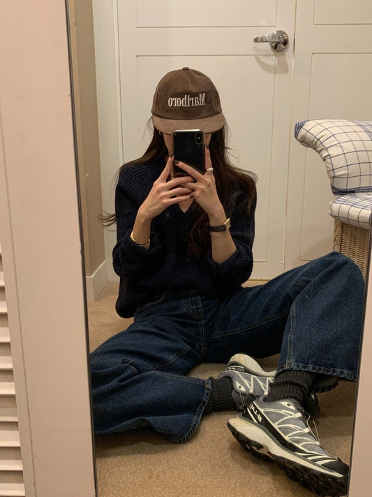 Fri. 美式慵懶 粗針V領休閒針織上衣 藏青