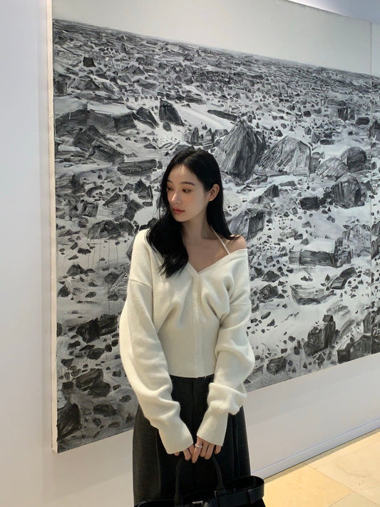 Fri. 經典設計款 氣質V領收腰感掛脖針織上衣 米/黑
