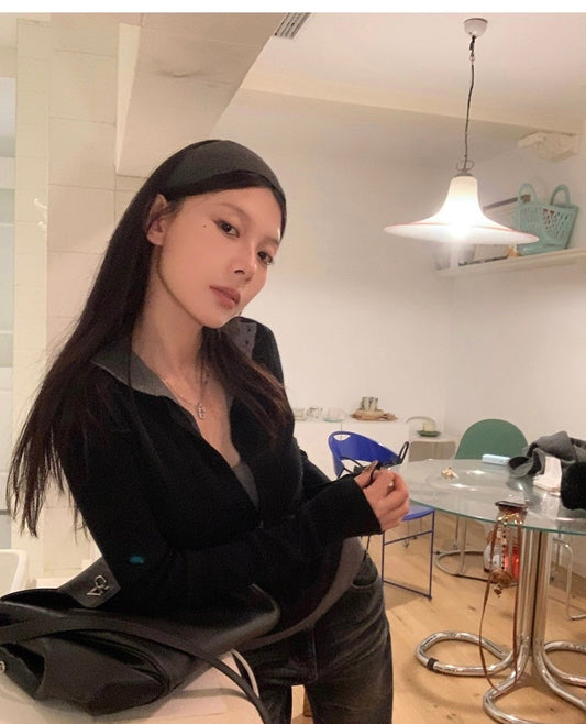 Fri. 氣質圓舞曲 襯衫領法式撞色拼接上衣 黑/灰