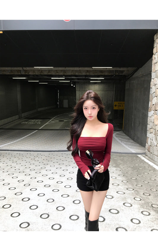 Thu. 韓模曲線 自帶胸墊方領顯瘦長袖上衣 紅/灰