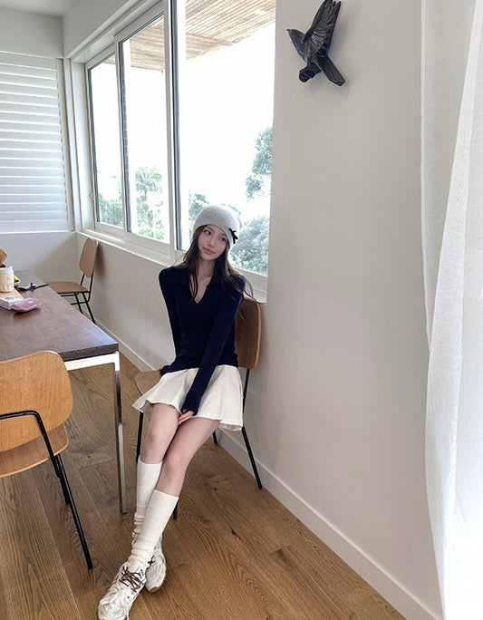 • Wed. 高允真同款 小香撞色U領修身針織上衣 藍/白