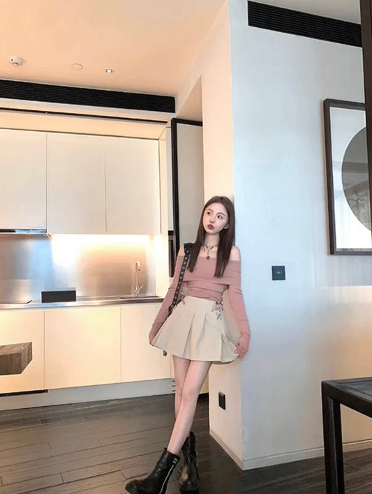 Wed. 小細腰 氣質軟糯親膚針織一字領上衣 粉/灰