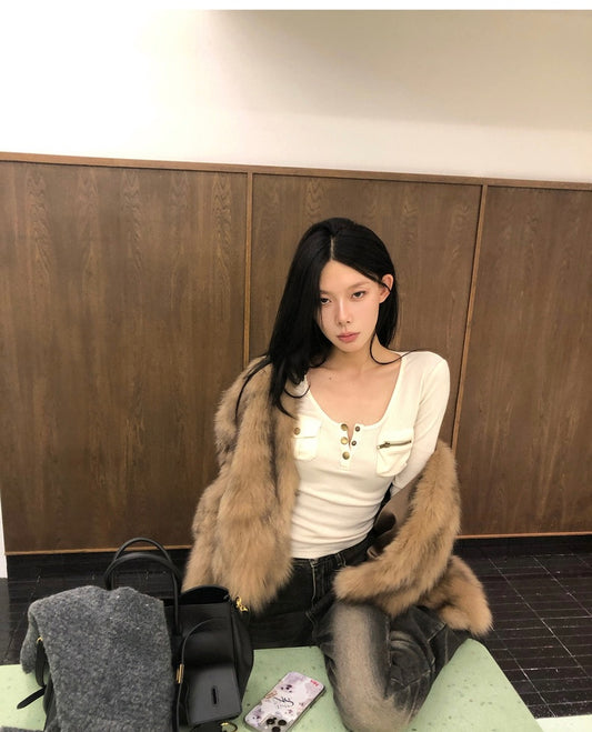 • Tue. 復古girl 口袋拼接U領修身上衣 杏