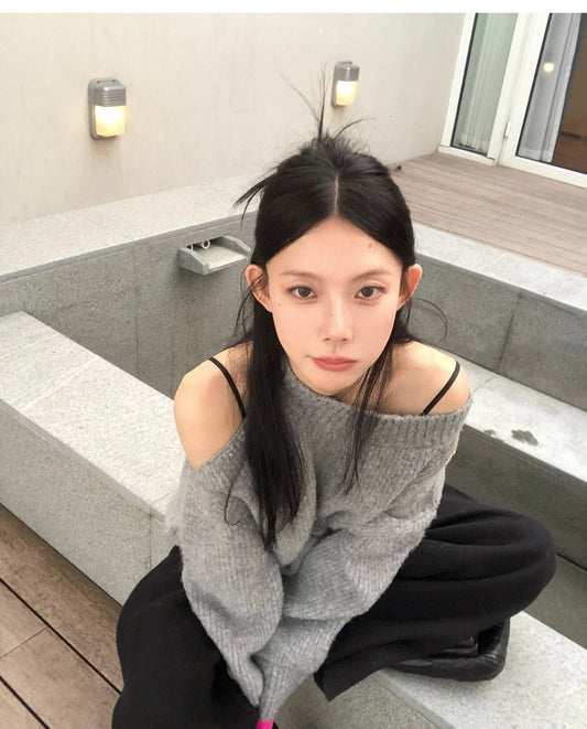 • Wed. 辣妹冬日 慵懶不規則露肩針織上衣 灰