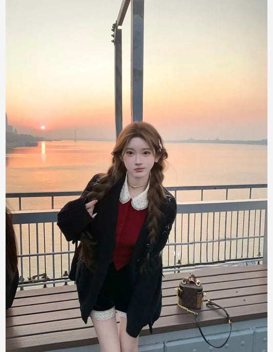 Thu. 節日戀人 拼色娃娃領顯白紅針織上衣