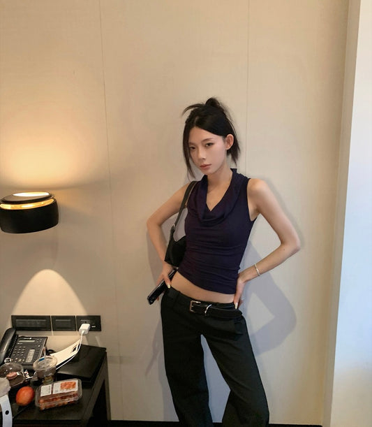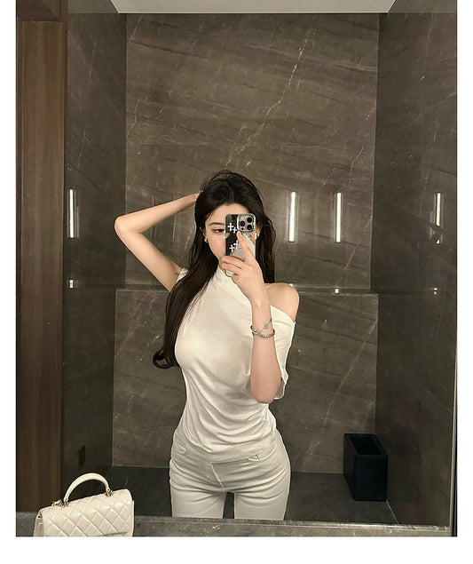 Wed. 露思休閒慵懶私服穿搭款 斜肩上衣 內搭撞色背心 短褲