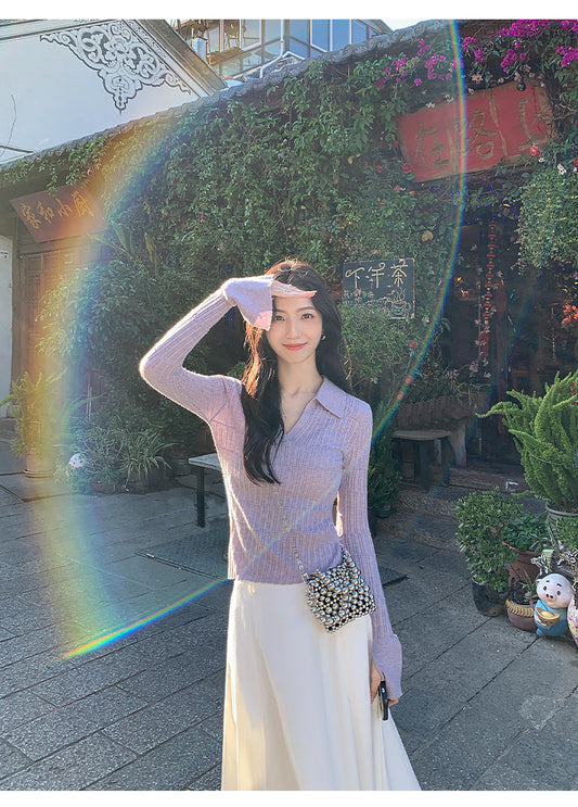 Tue. 氣質基礎 polo領修身針織喇叭袖上衣 紫