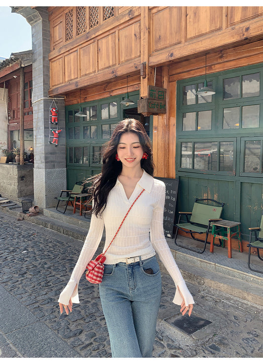 Tue. 氣質基礎 polo領修身針織喇叭袖上衣 米白/黑