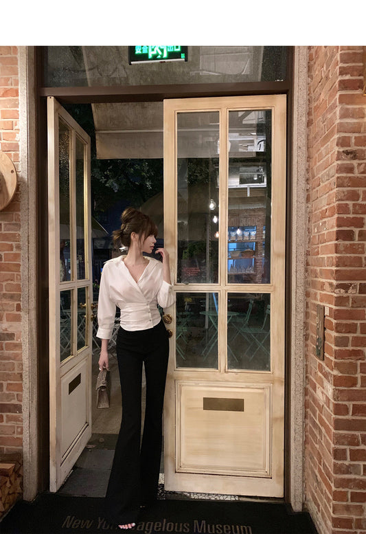 Wed. 韓女秘書 別緻收腰v領顯瘦襯衫 白