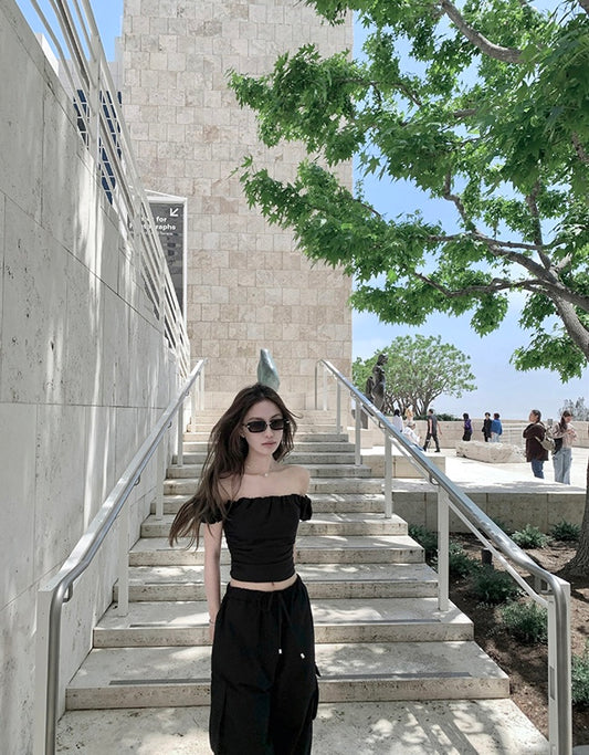 Wed. 慵懶週末 設計感花邊一字肩泡泡袖上衣 黑