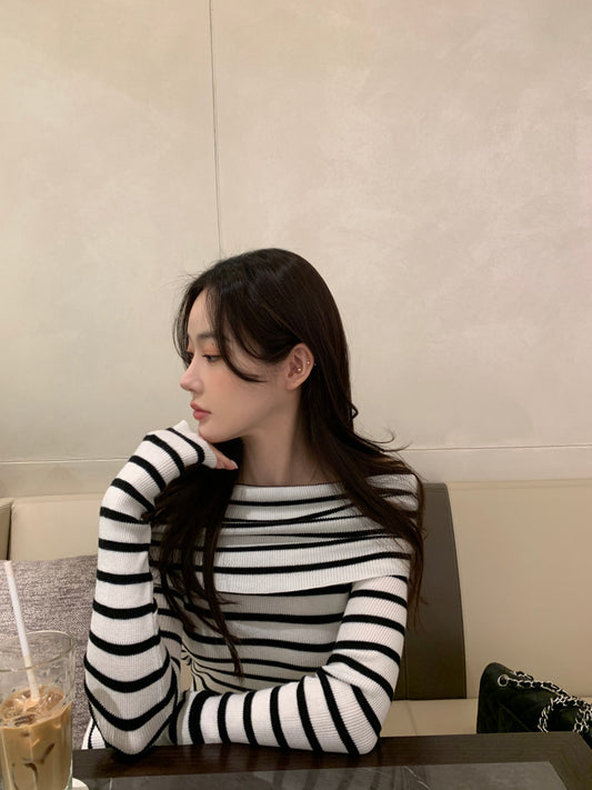 • Wed. 氣質簡約一字領羅紋上衣 條紋
