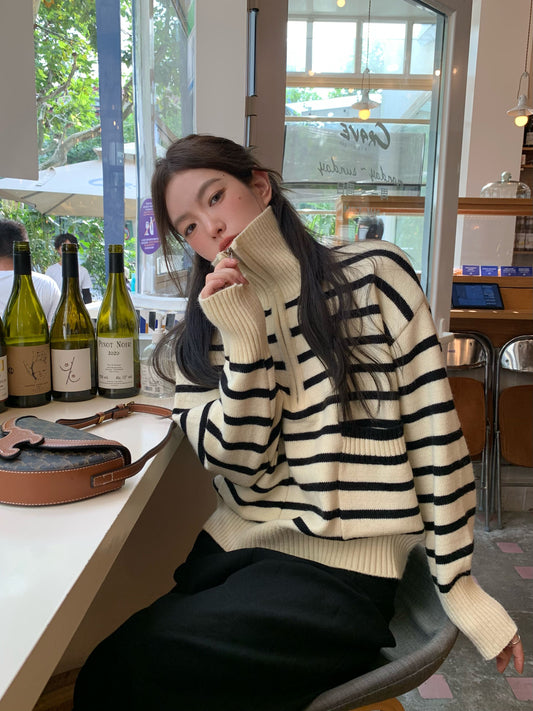 Sun. 高克重條紋羊毛翻領針織上衣