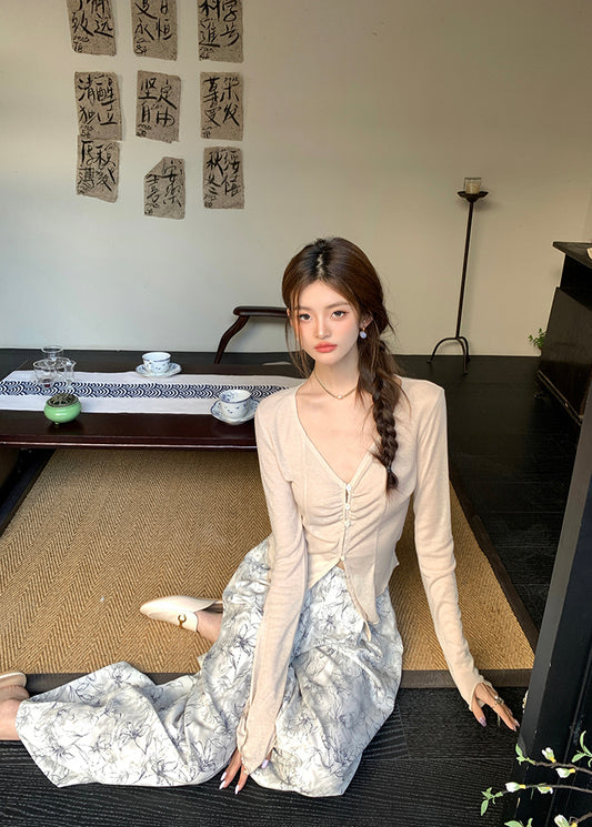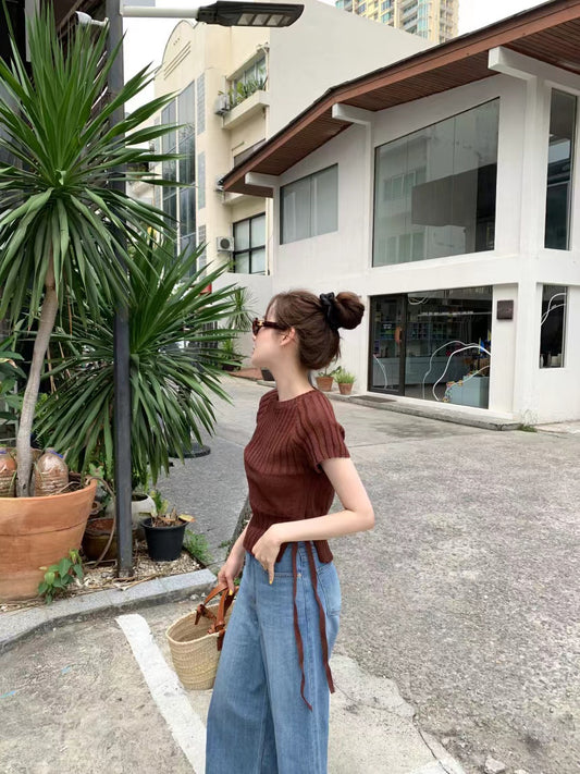 Tue. 氣質圓領腰側綁帶針織上衣 杏/咖