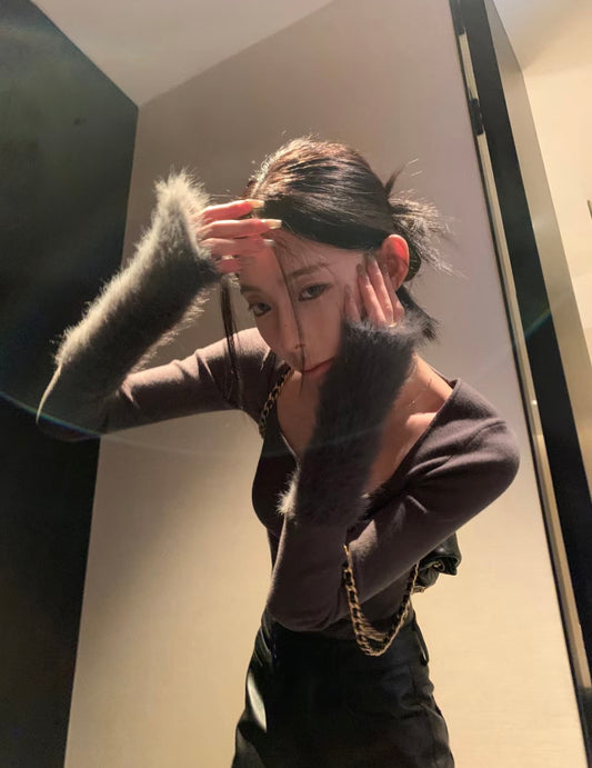 Sun. 方領修身貂毛打底上衣 黑/灰