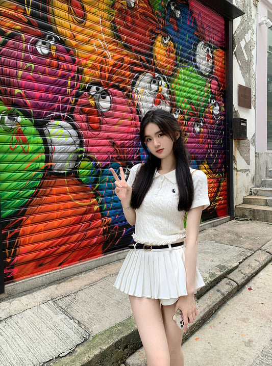 Wed. 老錢Polo領麻花刺繡上衣 白