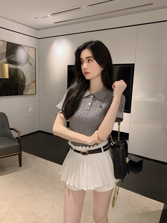 Wed. 老錢Polo領麻花刺繡上衣 灰