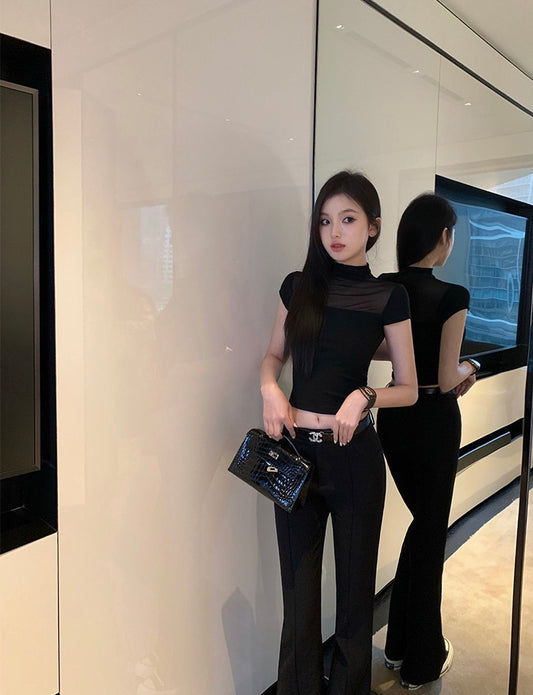 Wed. 透視微高領拼接上衣 黑