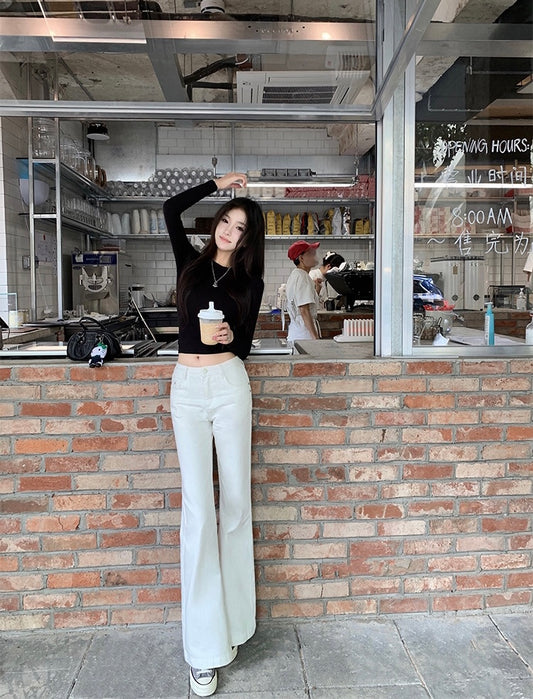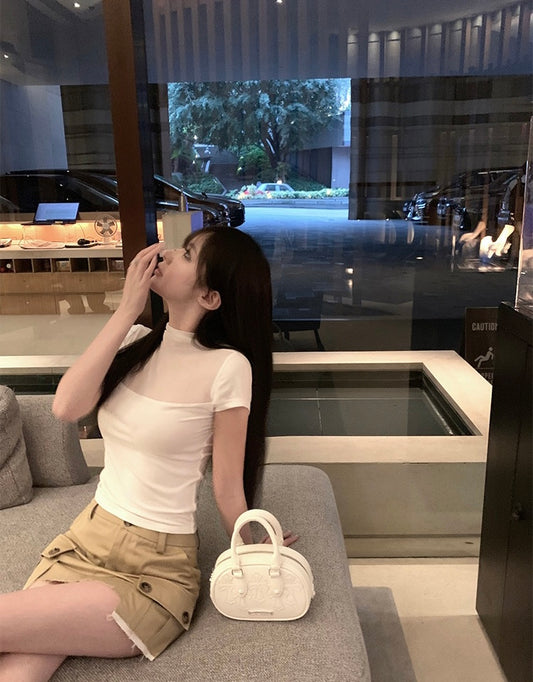 Wed. 透視微高領拼接上衣 白