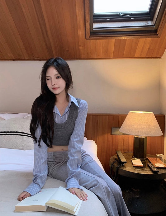 Wed. 學院針織背心襯衫2件組 灰藍