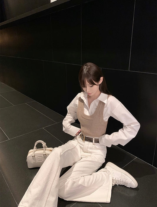Wed. 學院針織背心襯衫2件組 卡其白