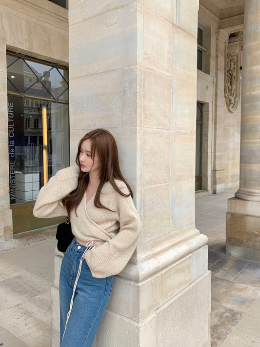 • Tue. 氣質圓領腰側綁帶針織上衣 灰