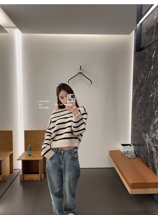 Tue. 慵懶一字肩條紋粗針上衣 杏
