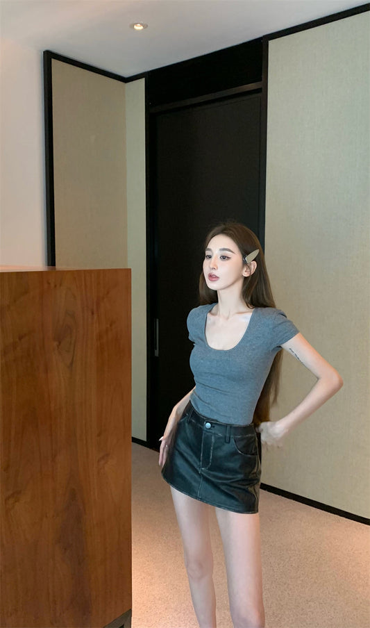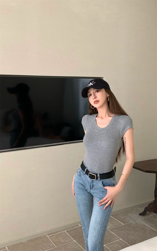 Mon. 彈力修身大U短版上衣 灰