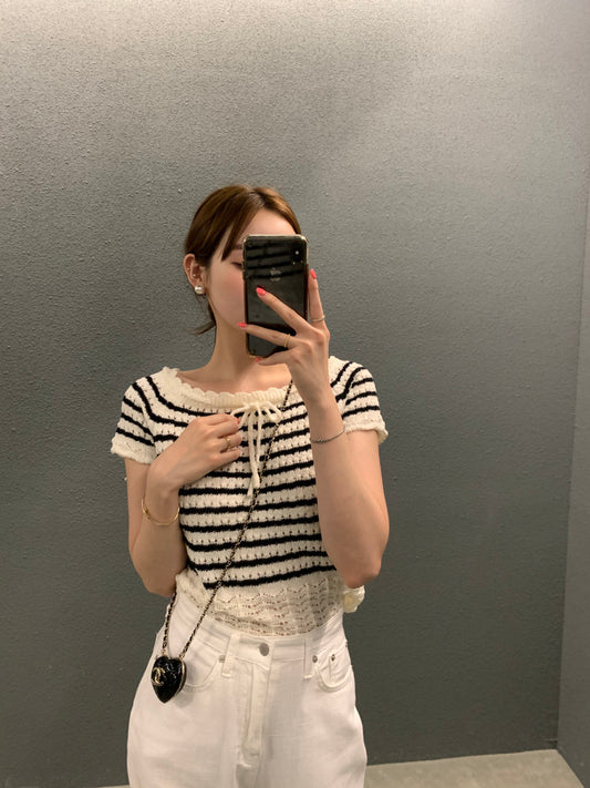 Sun. 縷空花邊蝴蝶結上衣 條紋