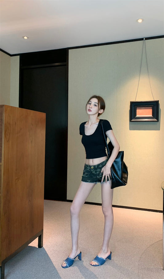 Mon. 彈力修身大U短版上衣 黑