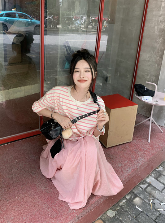 Tue. 夏日條紋圓領上衣 粉