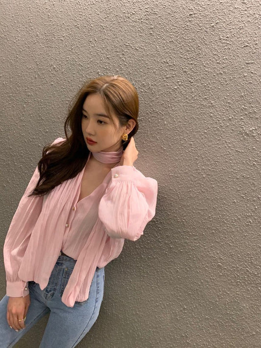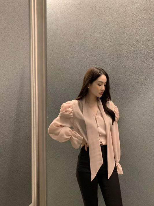 • Thu. 氣質歐膩肌理V領飄帶襯衫 粉