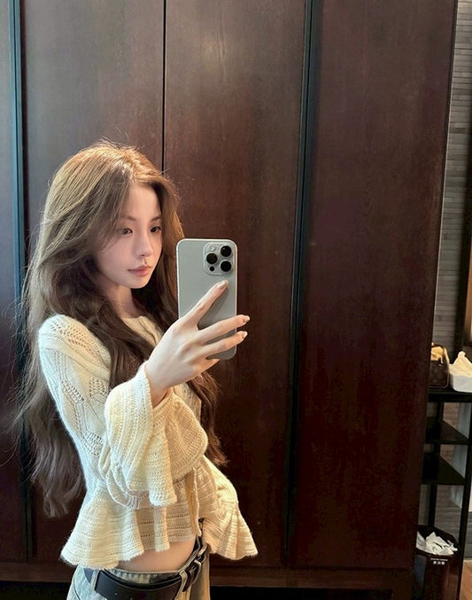 • Fri. 奶喵小隊 縷空鉤花袖羊駝針織收腰上衣 杏/黑
