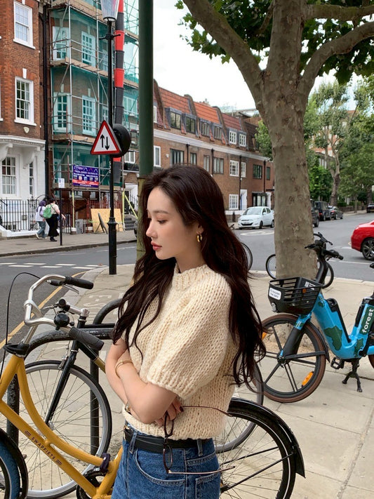 • Thu. 美式慵懶勾針短袖毛衣 杏色