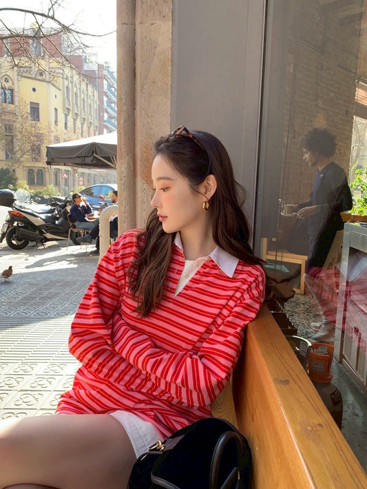 • Thu. 俏皮miu感條紋寬鬆polo領上衣 紅條