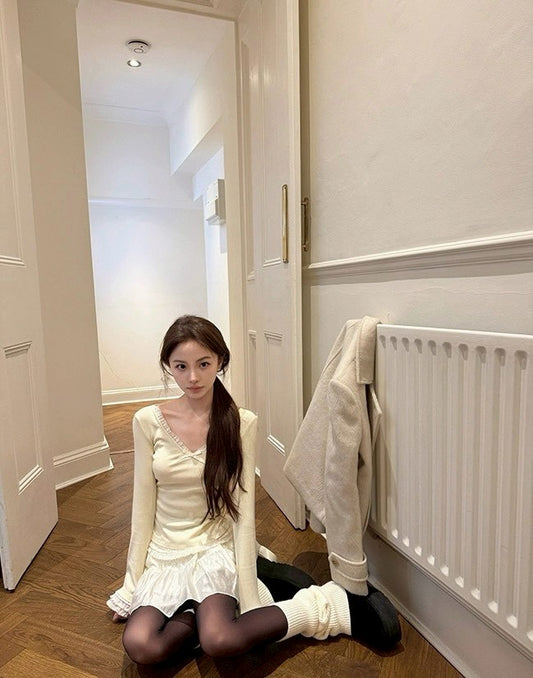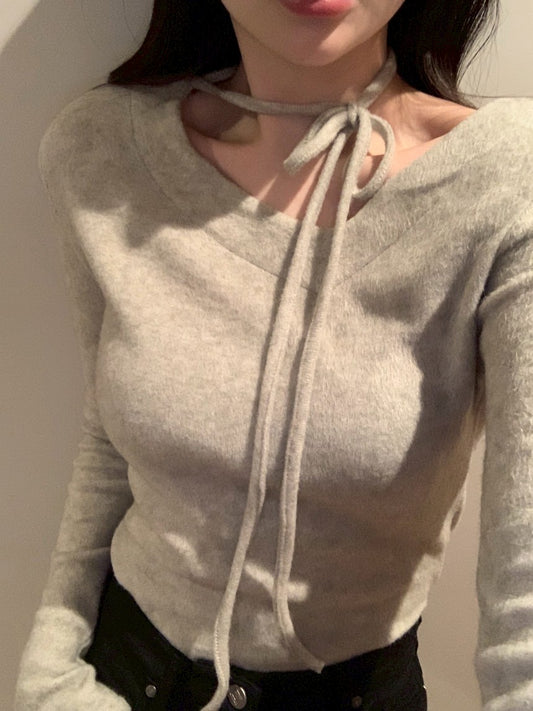 Thu. 法式鎖骨V領 繫帶繩款針織衫 杏/灰