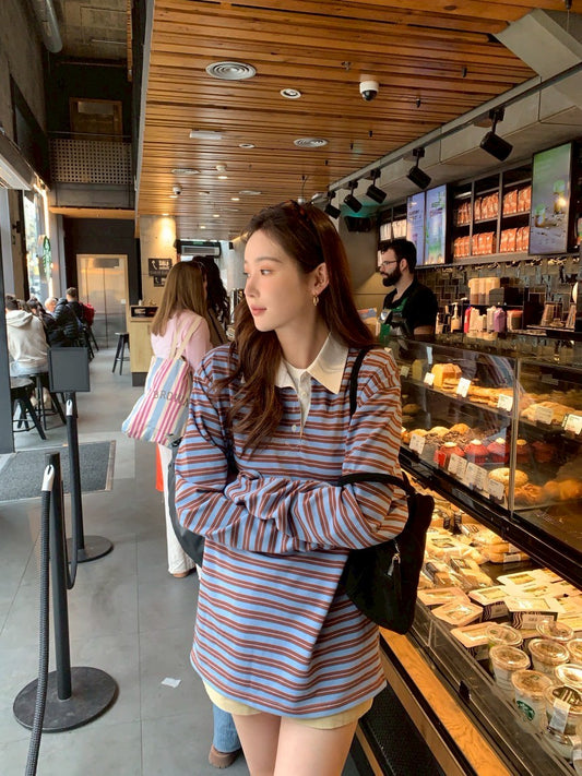 • Thu. 俏皮miu感條紋寬鬆polo領上衣 藍條