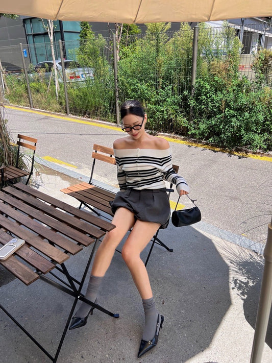 • Thu. 秋天百搭一字領條紋針織上衣 白底/紅底