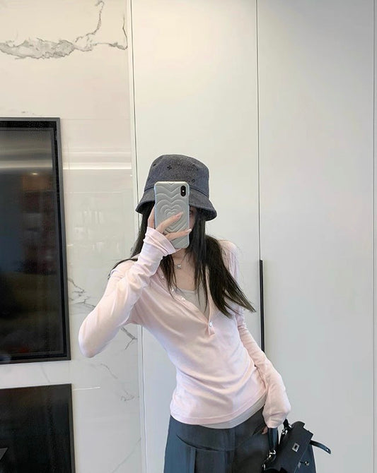 Mon. 輕鬆滿格不費力假兩件撞色V領長袖上衣 粉/灰